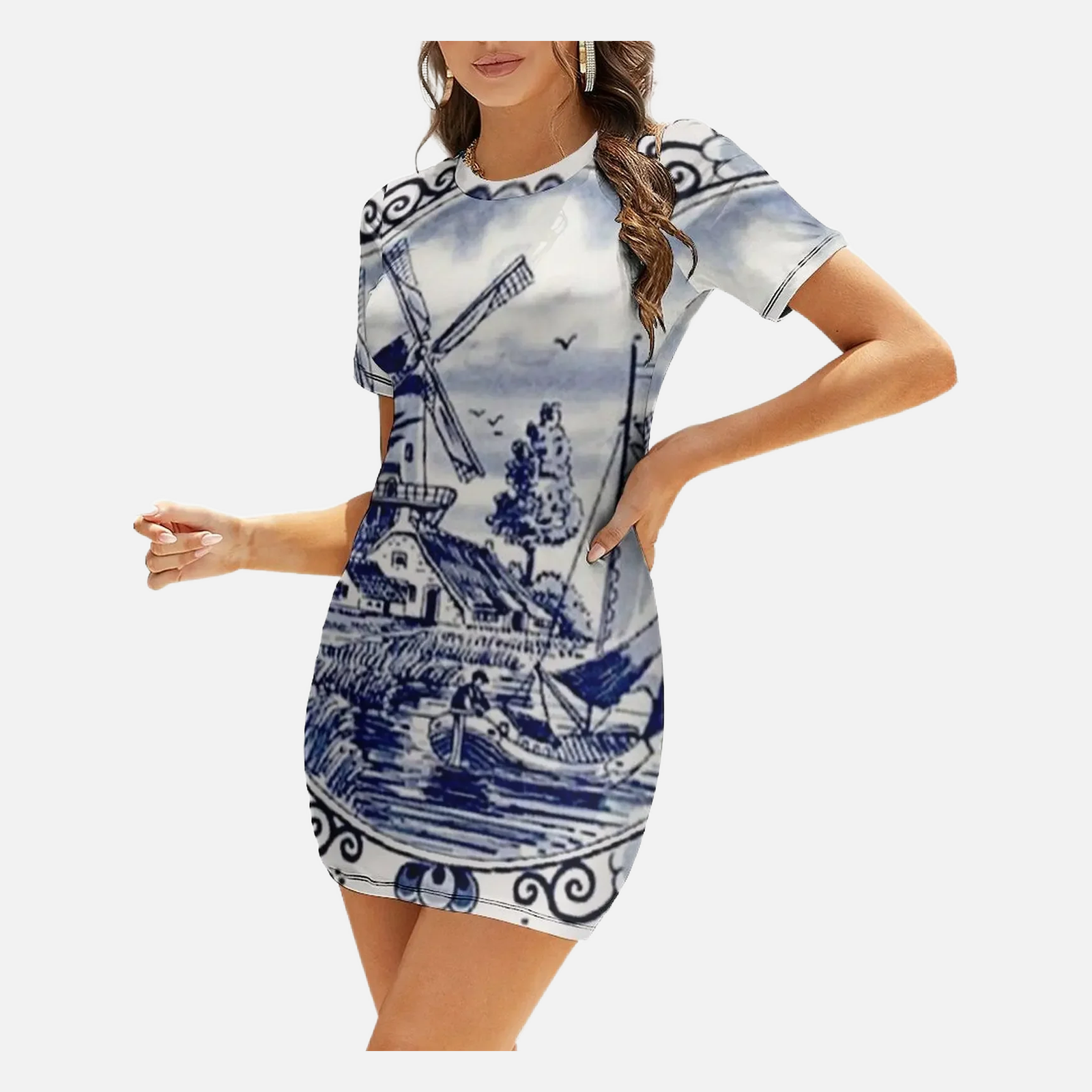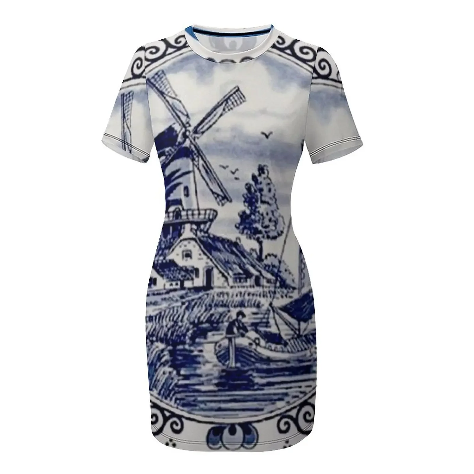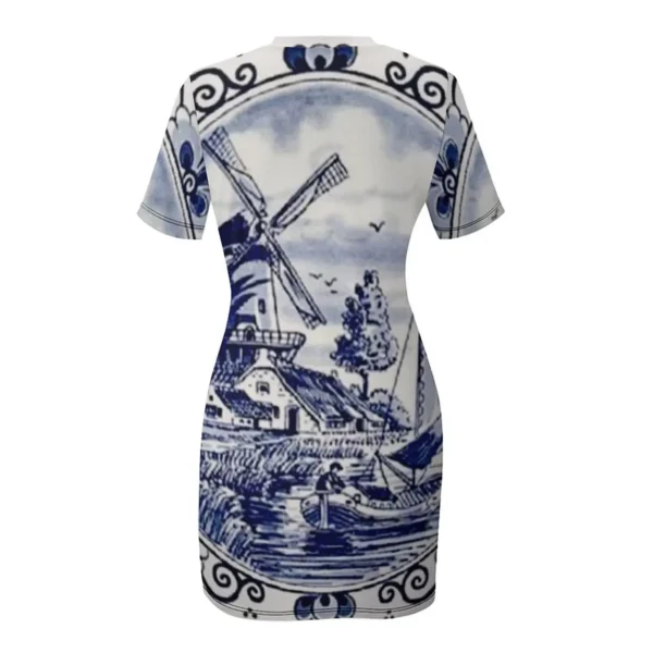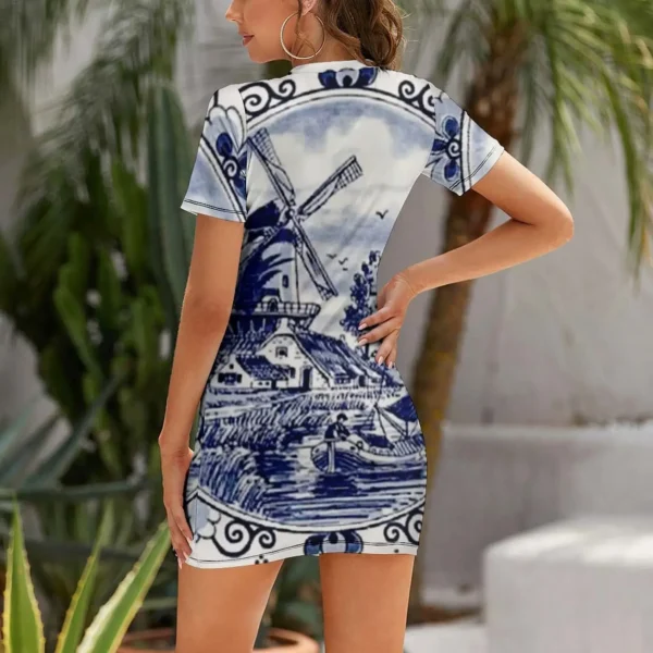 Blue Delft Print Short-Sleeved Elegant Women’s Dress